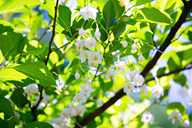 えごの花〜林野に生ずる落葉小喬木で、3メートルほどの幹は濃紫褐色で枝が多く、葉も香りも蜜柑に似ている。六月ごろ、枝の先に総状花穂に多数の乳白色の五弁の花をひらき、長く下垂するさまが美しく、また落花がみごとである。十月ごろ、実を結ぶが、果皮を噛むとえごいので、この名がある。種子はつぶして、漁獲のときの毒汁に用いられる。