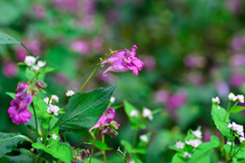釣船草(つりふねそう)〜山麓または野原などの湿地や水辺に生えている。茎は汁が多くて紅色を帯び、節の部分がふくらみ、茎の高さは4、50センチほどである。葉は先の尖った菱状の卵形で、縁には鋸歯がある。八、九月ごろ、茎の上に赤い腺毛のある花梗を出し、紅紫色の花をつける。花は長い距(けづめ)が下にぶら下がり、距の先端はくるりと巻いている。実は鳳仙花に似て、はじいて種子を飛ばす。花の形から名づけたもので、紫つりふねとも言い、同類に黄つりふねがあり、また、法螺貝草とも言う。
